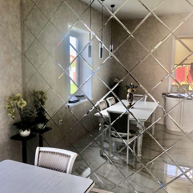 Использована квадратная серебристая зеркальная плитка размером 18х18.